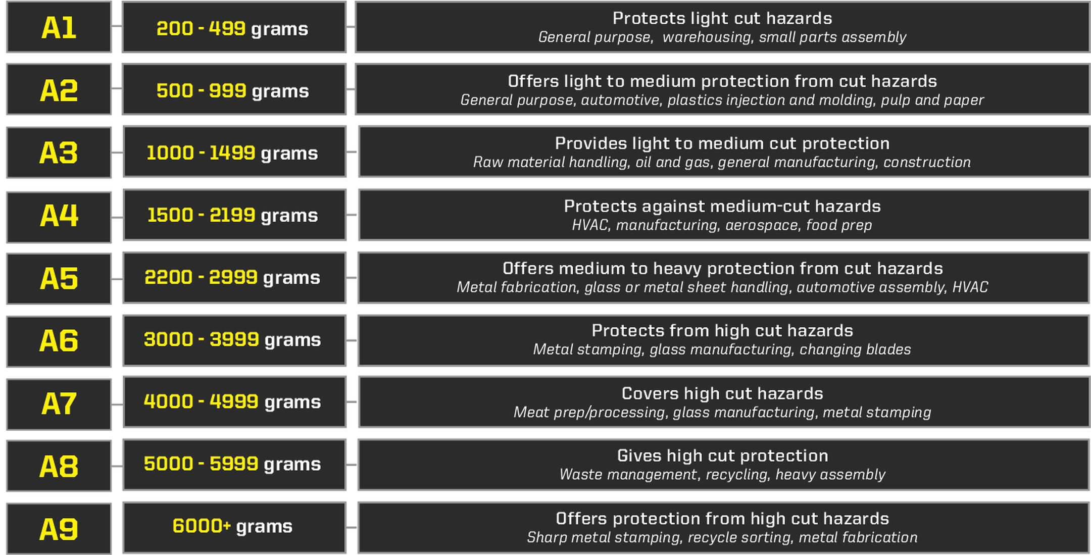 In 2016, International Safety Equipment Association (ISEA) and ANSI released an updated scale with nine levels of cut protection to measure performance. These levels indicate the grams of cutting load the gloves can bear from a sharp blade before penetrating.