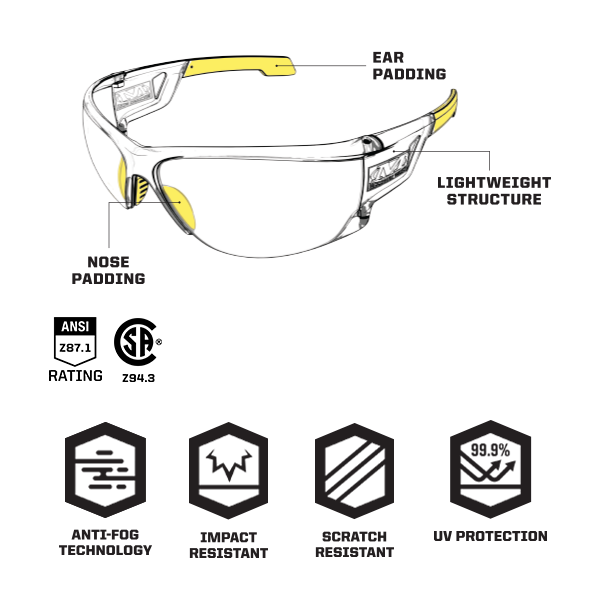 - Scratch resistant coated polycarbonate lenses provide clarity and protection.