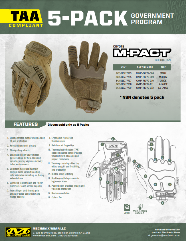 Mechanix Wear National Stock Numbers (NSN) are available by request. TAA Compliant gloves are available on our Website. Please fill out the form below and a member from our Government Team will follow-up with further assistance.